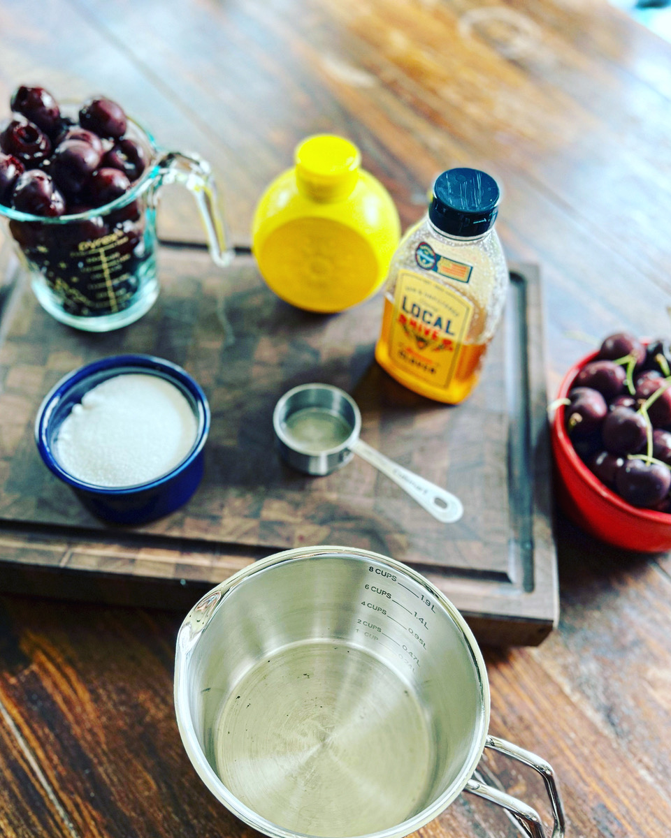 2. Add the pitted cherries, granulated white sugar, honey and lemon juice to a medium sized pot and allow to sit for 5 minutes stirring frequently to release some of the juices.
