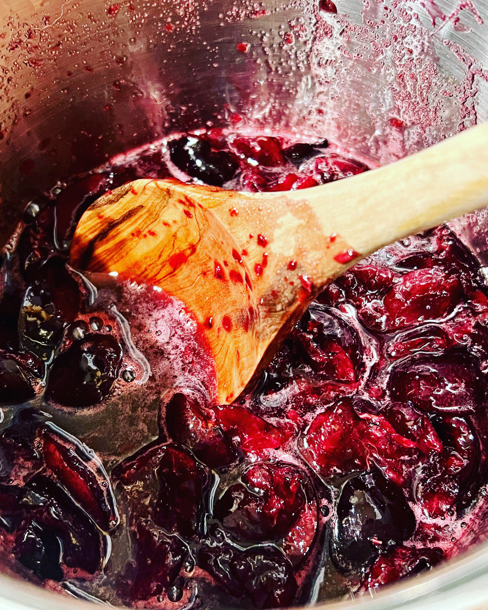 4. When the 30 minutes have passed, mix the cornstarch and water, add the slurry to the cherry mixture, and stir until thickened. Remove from heat.